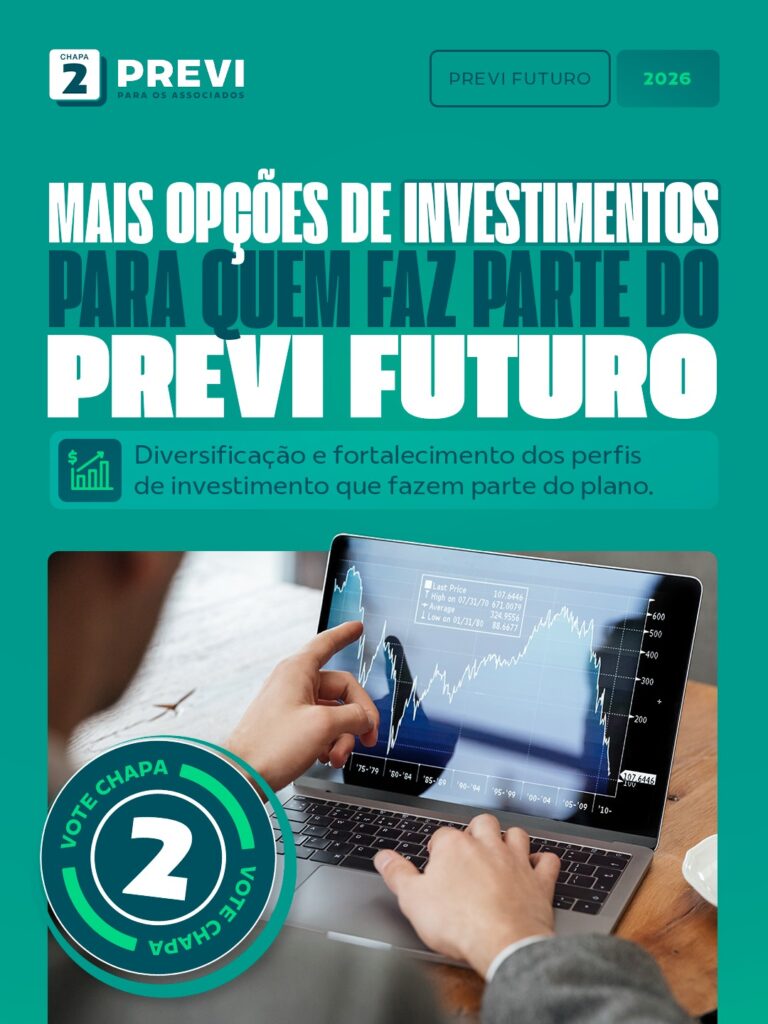 Quem faz parte do Previ Futuro está vivendo bons resultados, formando suas reservas e podendo escolher diferentes perfis de investimentos. Vamos diversificar e aprimorar esses perfis, ofertando também assessoria previdenciária e financeira. Defendemos ainda a alteração da fórmula PIP para uma contribuição proporcional à remuneração e ao benefício desejado, além de aprimorar os meios de comunicação.